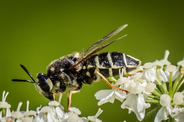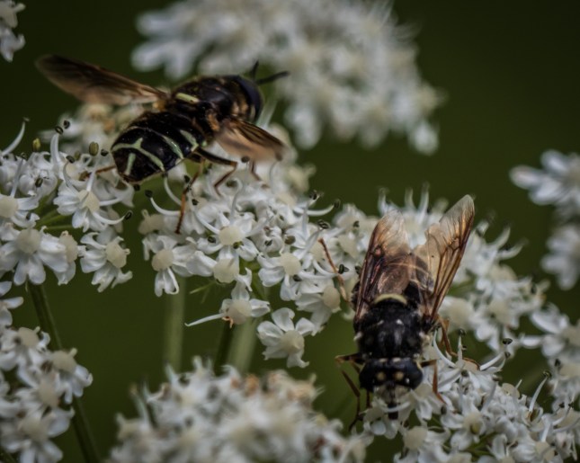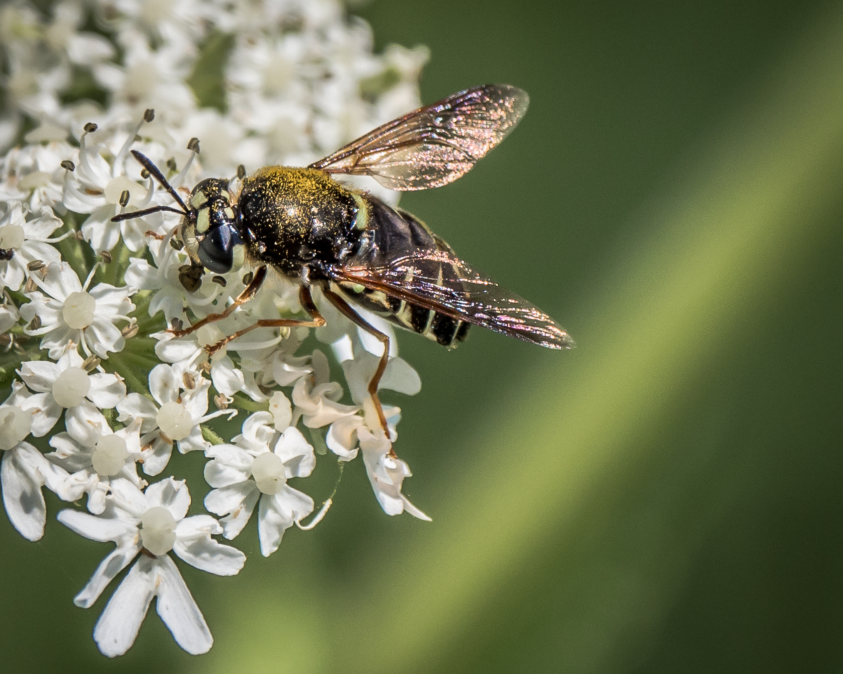 All four of these insects appear to be the same species. I think that they are hoverflies. But what kind??