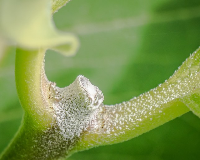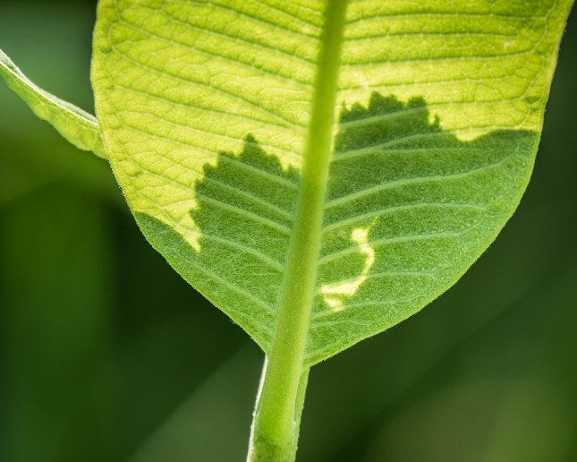 This shows the latex of the Common Milkweed. The latex contains bitter poisonous chemicals (glycosides) that make Monarchs unpleasant food (since they metamorphose from caterpillars that eat Milkweed leaves). This process leads to the mimicry of the Viceroy butterfly. Although I am not an experienced forager, I have tried pickled milkweed pods — which had an interesting texture.