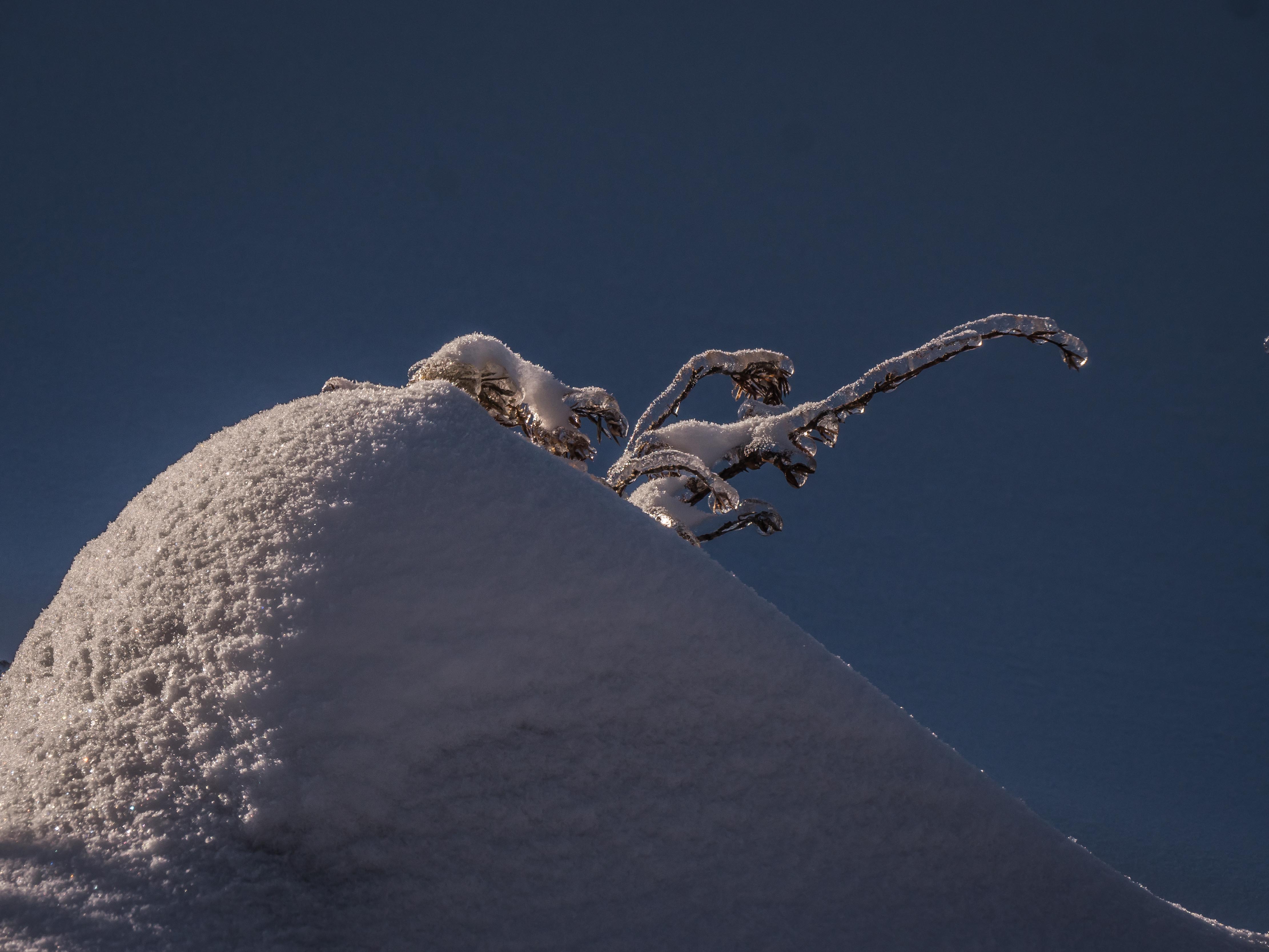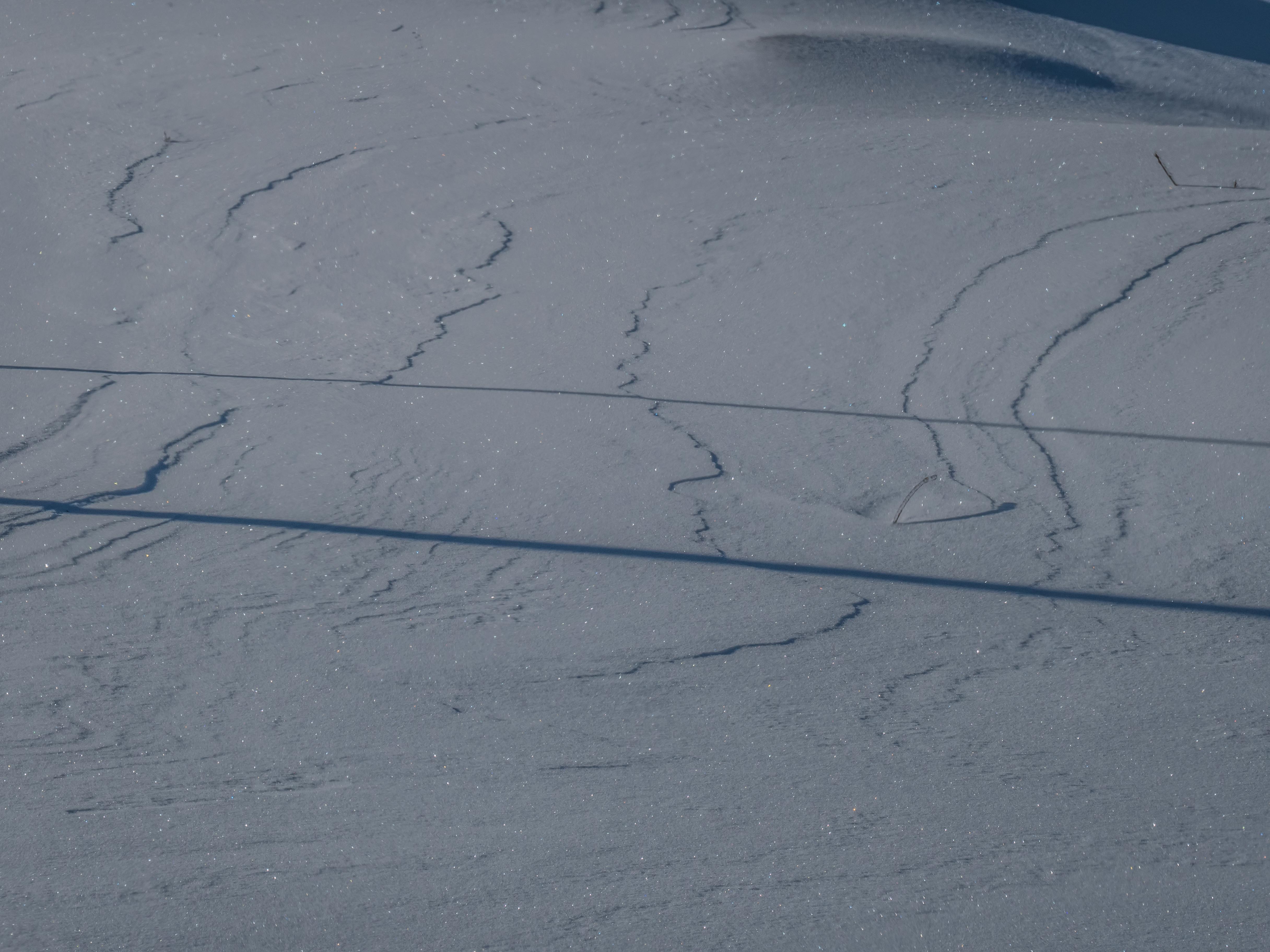 Sun is getting low on the horizon… giving the snow a pinkish glow while the shadows reflect the scattered sunlight of the blue sky above…
