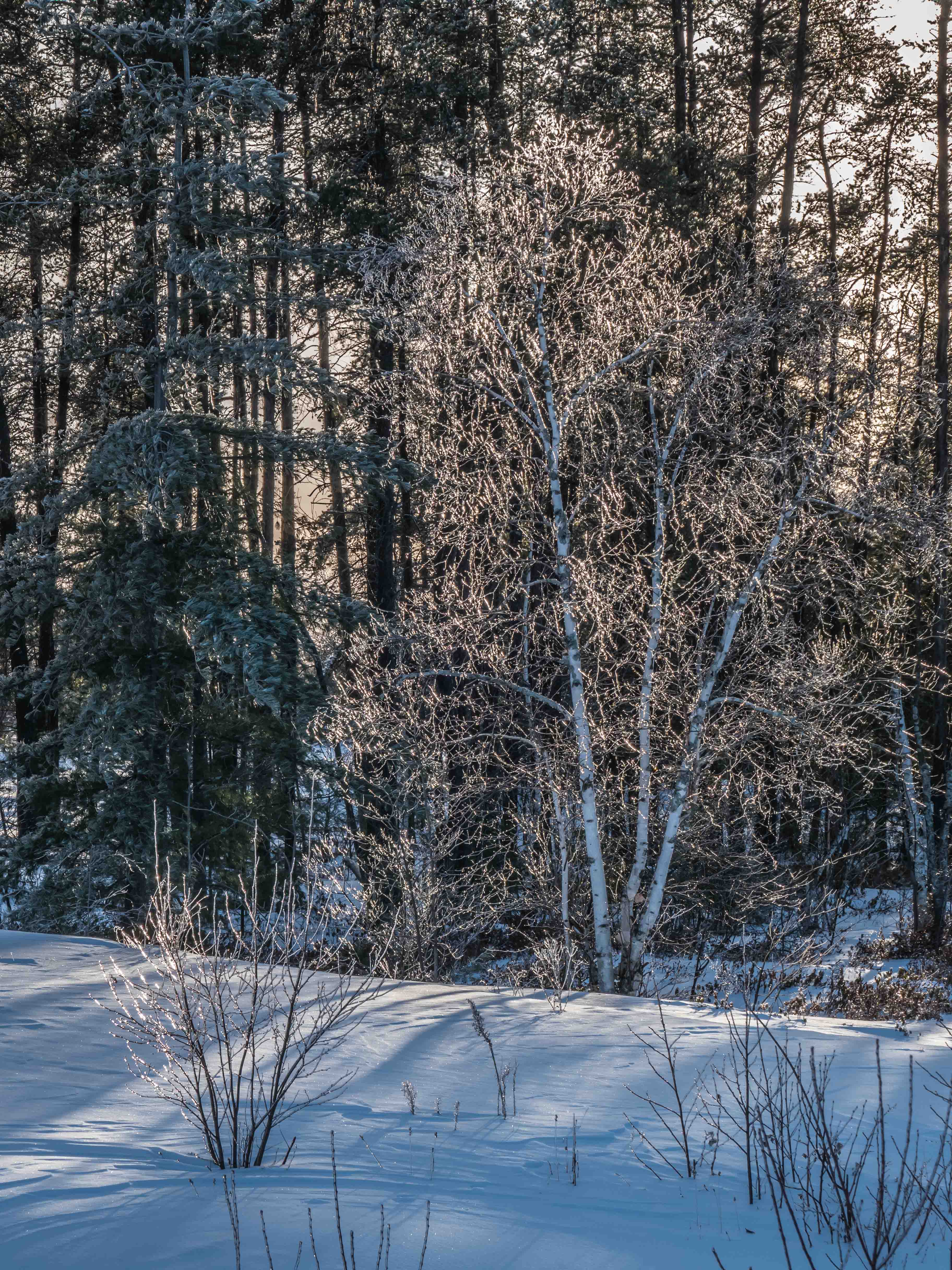 We practiced making pictures of falling snow, trying to capture the mood of the action. Focus mid-foreground. Longish shutter interval depending on windspeed driving the snow. Capture as much light as possible. I try to use ETTR generally.
