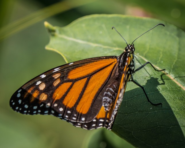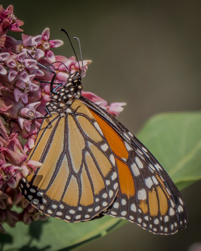 I think that this (Second Generation since hibernation in Mexico) female Monarch has just deposited an egg behind her right foot. The eggs deposited in mid-July will metamorphose into 3rd generation adults around mid-August. That generation will probably produce one more generation, the 4th, which will enter reproductive diapause so that their energy will be used for the long trip south. The reproductive effort is strongest in second and third generations. The first and last generations use substantial energy travelling.